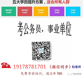 欢迎报考成人高考,更多函授咨询,请关注微信公众号:广西成考网 ,杜老师电话、微信:19178781701 具体了解!电子注册,学信可查,2.5年毕业,国家承认有效学历。