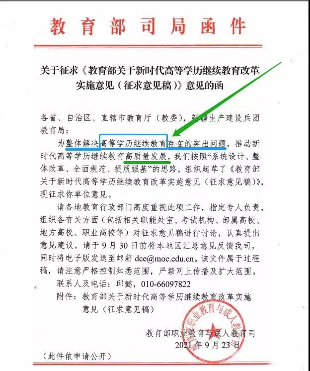 最近,教育部职业教育与成人教育司发了一个征求意见函:高等学历继续教育改革实施意见(征求意见稿)。