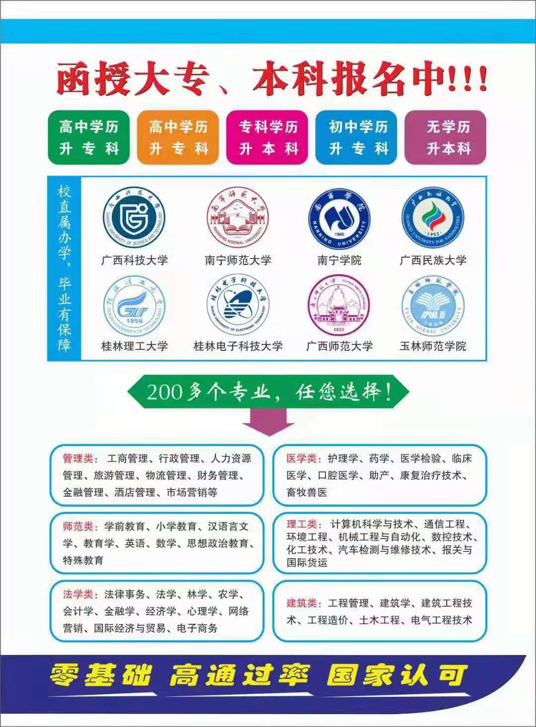 成人高考: 广西科技大学、广西民族大学、南宁师范大学、南宁学院、桂林理工大学、广西师范大学、桂林电子科技大学、桂林医学院、北部湾大学、右江民族医学院、广西医科大学、广西中医药大学等