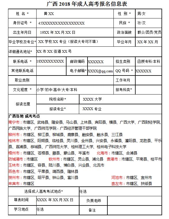 广西各城市均设有考点:南宁成人高考报名、柳州成人高考报名、桂林成人高考报名、玉林成人高考报名、梧州成人高考报名、河池成人高考报名、百色成人高考报名、崇左成人高考报名、钦州成人高考报名、北海成人高考报名、贺州成人高考报名、来宾成人高考报名、贵港成人高考报名、防城港成人高考报名等。