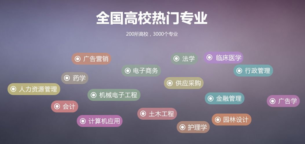 (高起专)学前教育,会计,护理,工商企业管理,市场营销,行政管理,小学教育,人力资源管理,药学,法律事务,建筑工程技术,汽车检测与维修技术,旅游管理,计算机应用技术,电子商务,临床医学,机电一体化技术,财务管理,工程造价,电气自动化技术,建设工程管理,烹调工艺与营养,计算机信息管理,汽车运用与维修技术,汉语,医学检验技术等