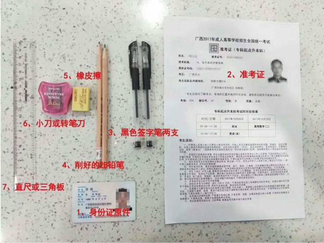 考生须知 1)关注准考证上的考场位置 准考证上都会标注:考试时间、考场名称、地址、座位号等信息,大家要注意考场名称、地址。 考点地址:准考证上有标注,大家可以使用百度地图等工具进行定位查询。 2)查询考场位置 根据准考证上的考点地址,大家可以用百度地图等工具进行定位、查询附近公交站点、地铁站点或驾车线路,做到心里有数。 如果是异地参考记的考生,请一定要提前买好车票和订好宾馆,考试期间,由于大量外地学生集中参考,所以住宿会很紧张。 建议提前预定在25日中午或下午,以方便各位同学提前踩点考场,避免考试当天找不到考场,从而错过今年考试。 3)熟悉考场周边情况 大家可以用百度地图等工具进行定位、查询考场周边情况,最好是考前一周周末或平时下班,可以去考场周边溜达一圈。 考试一般是一天半或两天,午餐需要在考场周边解决,熟悉周边情况方便解决用餐。 建议您在考试当天不要去太远的地方就餐、也不要吃过度辛辣等刺激性的食物,以免身体不适影响考试。 4)整装待发 考试前两天,请提前准备好所需的文具和证件,避免前一天手忙脚乱,漏带重要证件。 1、身份证 2、准考证(10月中旬起可打印准考证) 1、黑色签字笔 2、2B铅笔 3、橡皮 4、转笔刀 5、直尺 1、无线通讯工具 2、涂改液、涂改带 3、文字材料(如草稿、复习资料) 4、智能手表 5、电子记忆存储设备 5)存包考试 到达考点学校进入考场后,请把您的包(手机关机放在包内)放在考场存包处,只能拿透明笔袋和身份证、准考证进场参加考试。 没有存包处的考场,手机可关机放在包内,但要放在考场指定位置。需要提醒大家,手机一定要保持关机状态,如有震动或提示音会被误认为“作弊”将取消该科目考试成绩。 6)必看考试规则 (1) 考生进入考场,按座位号,坐下后需要把准考证及身份证件放在桌子右上角,以便监考老师审核。 (2)每门开考15分钟后,将不得进场,请大家一定提前到达考场。 (3)考试开考信号发出后才能答卷,结束铃声后不能答卷,开考前监考老师会按顺序发放答题卡、试卷、条形码、草稿纸,如有破损请举手示意监考老师解决。 (4)开考信号发出后,考场内禁止互借文具,请大家考前备好相关考试文具。 (5)在考试中,请不要携带涂改液、涂改带等日常修改工作,书写错误,请及时划掉在后面直接再写即可。 (6)考场内禁止自带草稿纸和与考试相关的文字复习资料,每门考试试卷都备有草稿纸空白页,请在指定草稿上做草稿,考试结束后草稿纸由监考老师回收。如您想在复习一下知识点,可在午餐后休息时间段内回顾,进入考场续放入包内存包处理。 (7)禁止携带智能手环、手表和有存储记忆通讯设施的电子设备进入考场,需考前存包处理。 (8)一般在该科考试结束前30分钟才可以提前交卷,提前交卷的后不要再考场内逗留或结伴喧哗。 温馨提示 当一门考试结束后,不要忙于和朋友对答案、因为参加成考的人群多以基础薄弱者为主,大家的答案五花八门,越对越错,影响心情。 大家还是要尽快休息或者把下一场考试科目的重点内容、重点公式在头脑中过一遍,以良好的状态迎接下一场考试。 成人高考是全国统一的入学考试, 不管同学们在广西哪个城市及乡镇,都可以找陈老师报名, 就近安排考点,入学后不用到学校上课,全程管理,直到毕业! 免费赠送成考复习资料,不方便到教学站领取的同学,老师统一安排邮寄! 早报名早复习,也能安心工作哦! 所持毕业证书可报考研究生、职业资格证、公务员、出国留学、求职就业、升职加薪、职称评定等。 报名联系:陈老师 报名热线:191 4891 5053 (微信同步) 咨询 QQ:347 599 3709(备注:成考咨询) 了解更多函授信息,关注微信公众号:广西大专本科函授中心