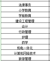 法律事务、小学教育、学前教育、建设工程管理、会计、行政管理、护理、药学、机电一体化、计算机网络技术、旅游管理