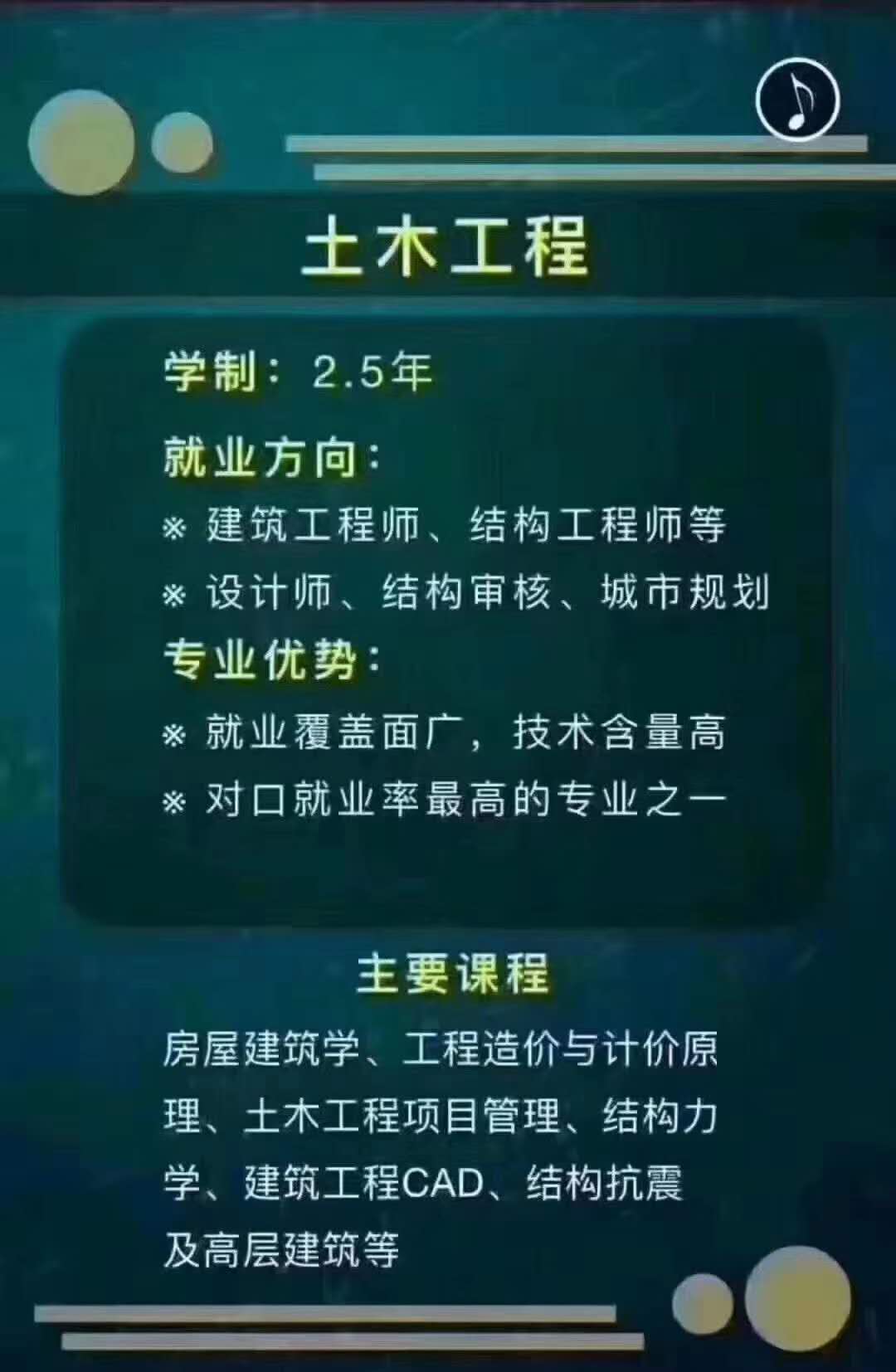 专业介绍:土木工程专业,是大学的一种自然学科。专门培养掌握各类土木工程学科的基本理论和基本知识,能在房屋建筑、地下建筑、道路、隧道、桥梁建筑、水电站、港口及近海结构与设施。