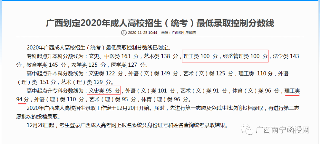 2020年广西成人高考录取分数线(借鉴)