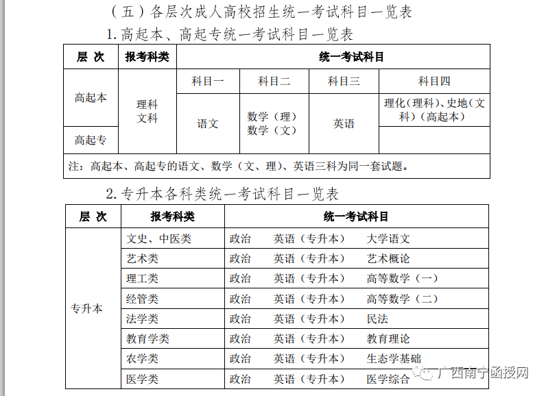 广西成人高考考点分布: