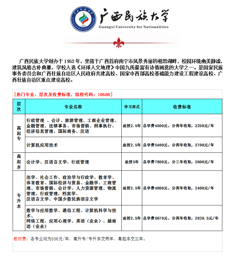 各专业教材费:350元/年.高升专,专升本,交两年;高升本,交四年。