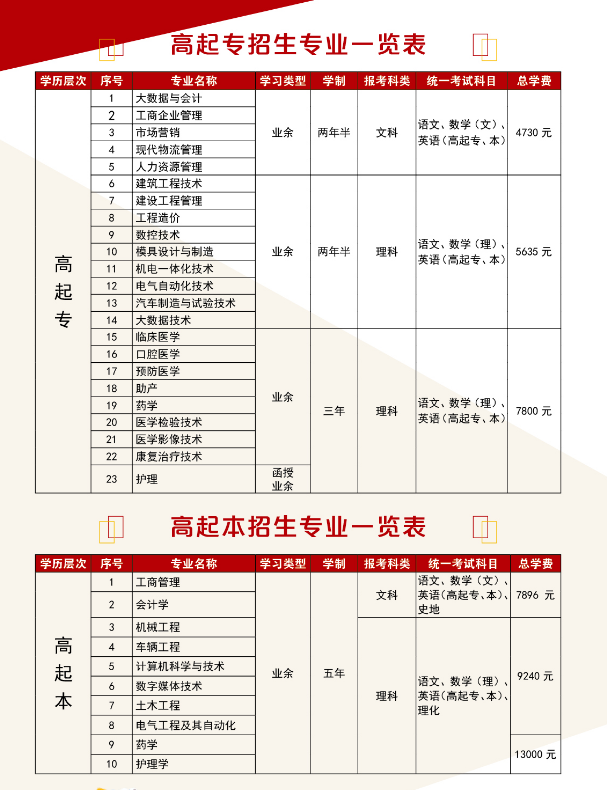 高升本(5年):法学、行政管理、会计学、汉语言文学、学前教育、小学教育、旅游管理、英语、机械工程、计算机科学与技术、车辆工程