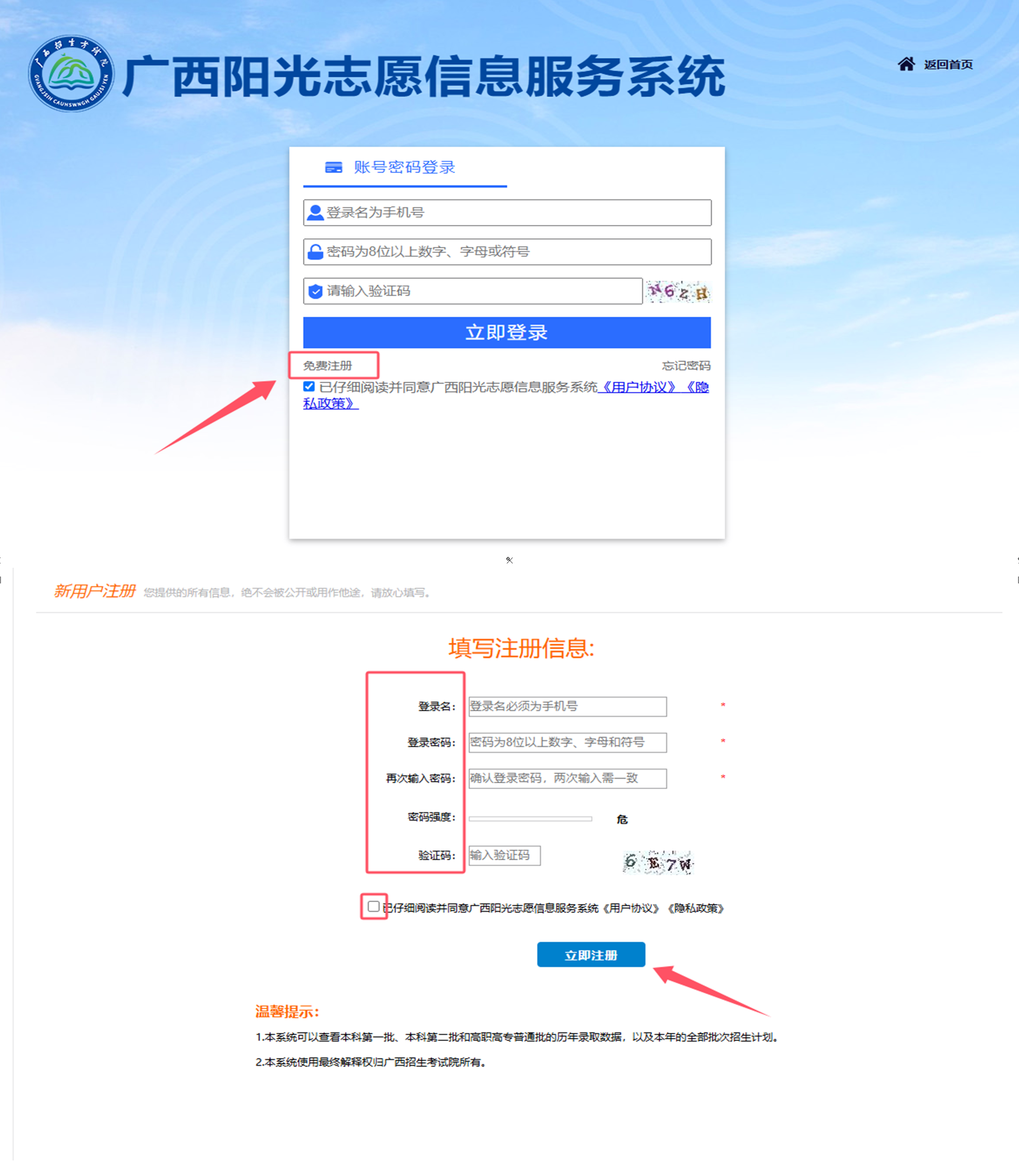 PC端:打开电脑浏览器,复制链接https://zyfz.gxeea.cn到地址栏,回车进入系统。新用户点击“免费注册”,依次输入登录名、登录密码、验证码,勾选同意后点击“立即注册”;