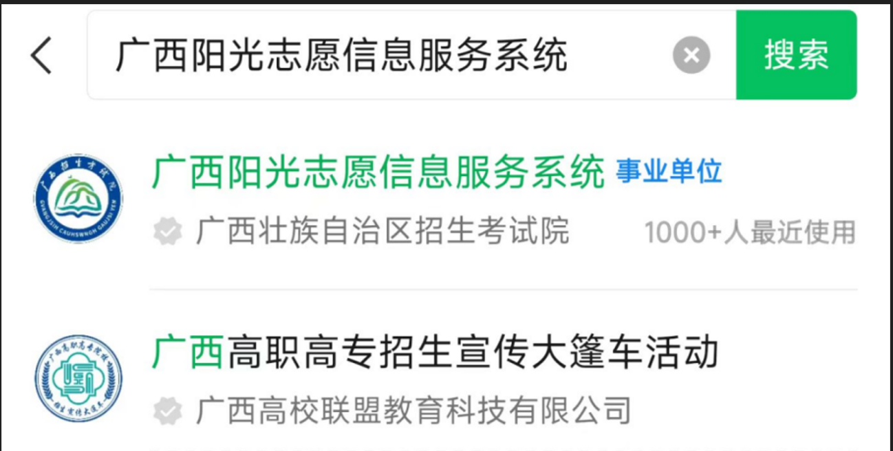 或进入微信下拉页面,在右上角搜索框中输入“广西阳光志愿信息服务系统”即可进入。