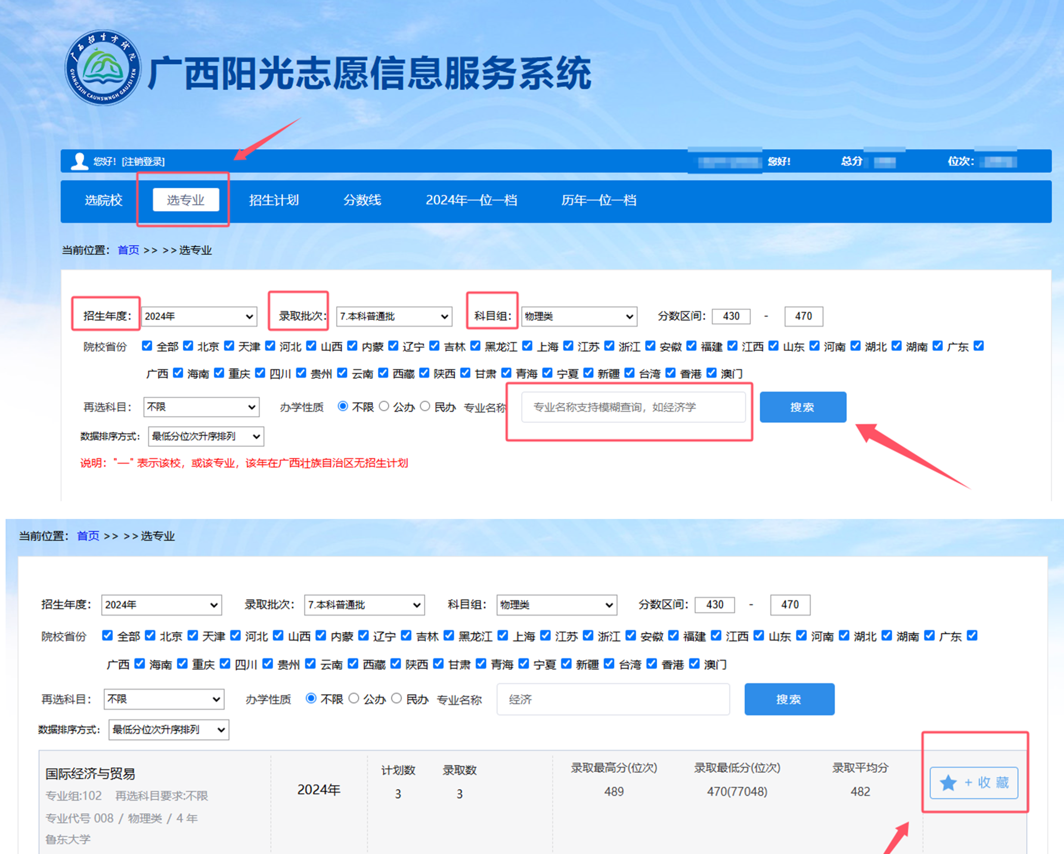 按专业查询时,点击“选专业”,设置相关条件后搜索,心仪专业可直接“收藏”。也可直接填写心仪专业,点击“搜索”,便于更好地选择专业。点击右侧“我的收藏”可查看收藏内容及更多信息。