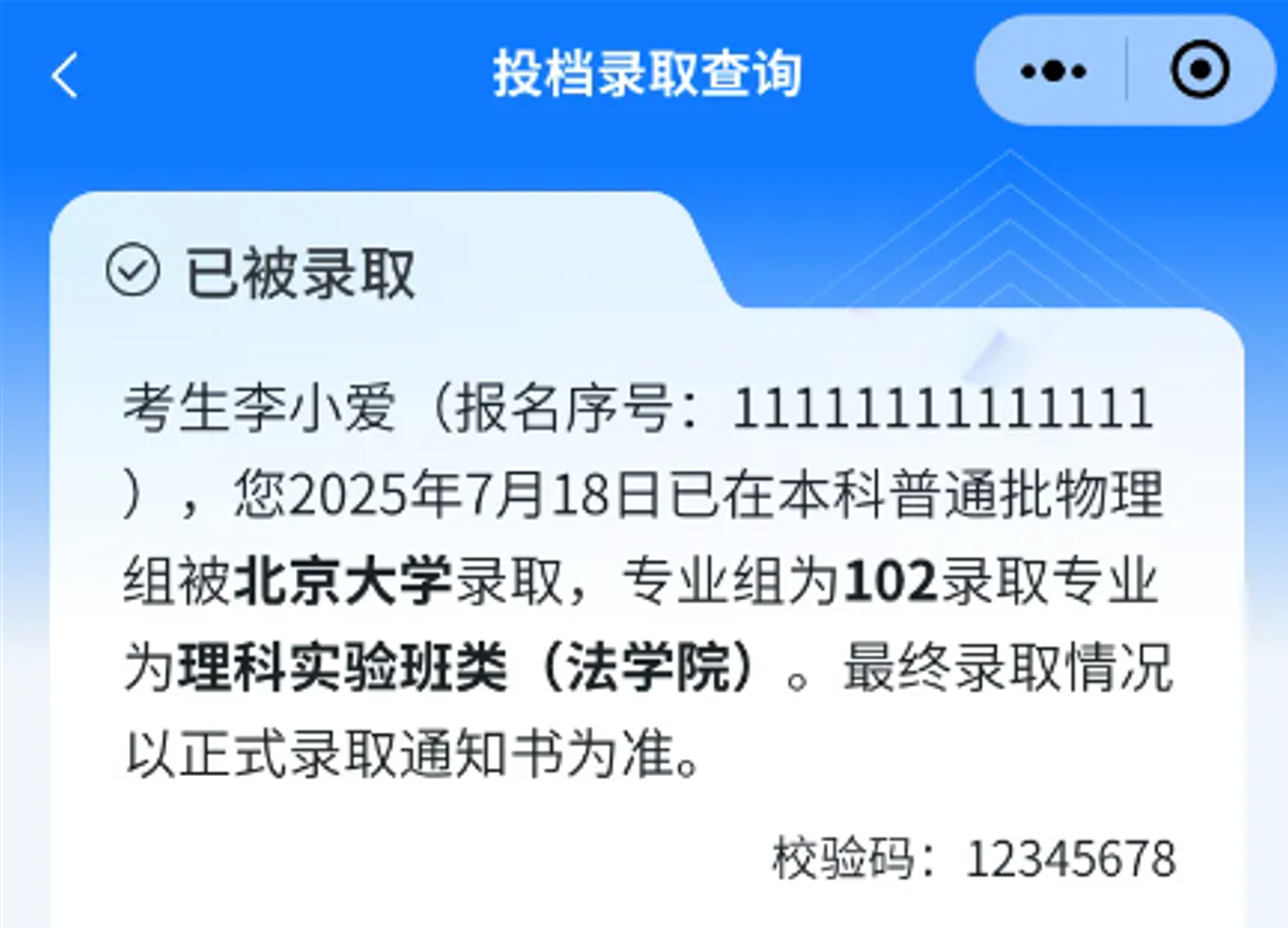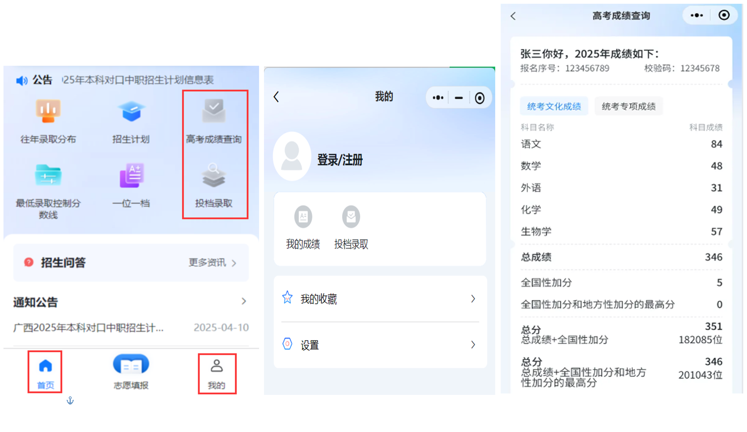 通过微信小程序登录的考生,在“首页”或“我的”页面中,点击“我的成绩”“投档录取”,进入查询页面,即可查询高考成绩与录取情况。需注意,高考成绩和录取信息查询时间以广西招生考试院发布时间为准。