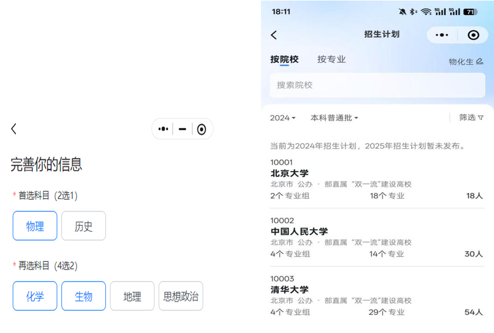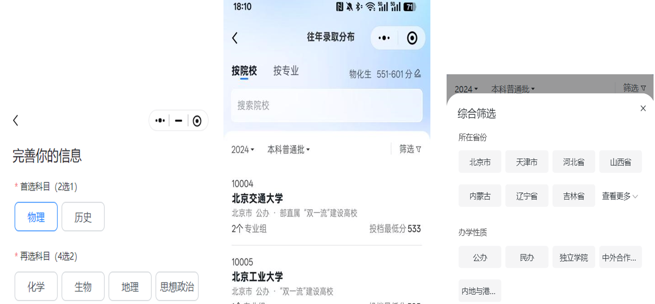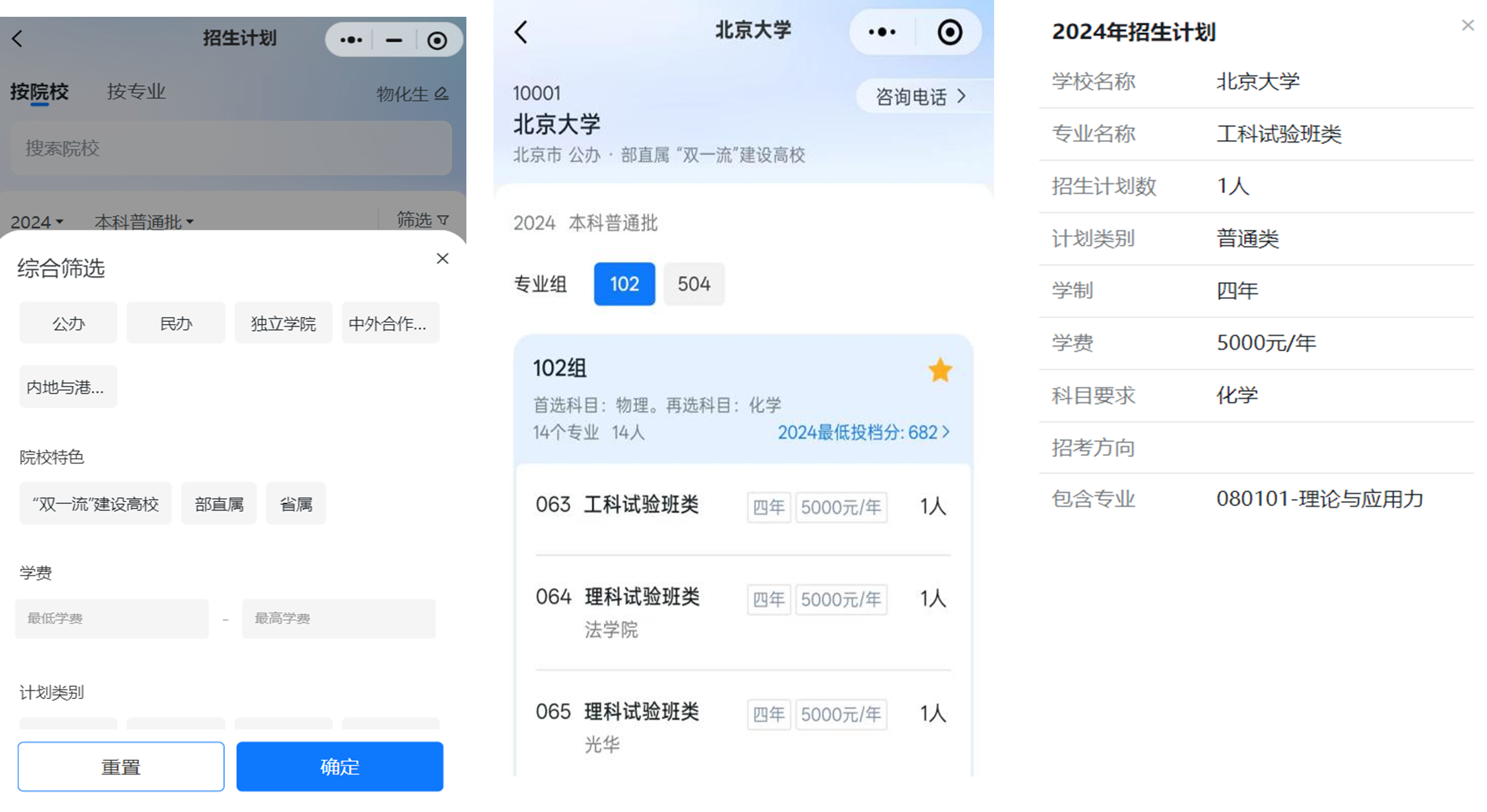 微信小程序:考生完善个人信息,系统自动匹配符合条件的院校招生计划,可输入院校或专业,以及设定筛选条件,查询指定院校的招生计划情况。