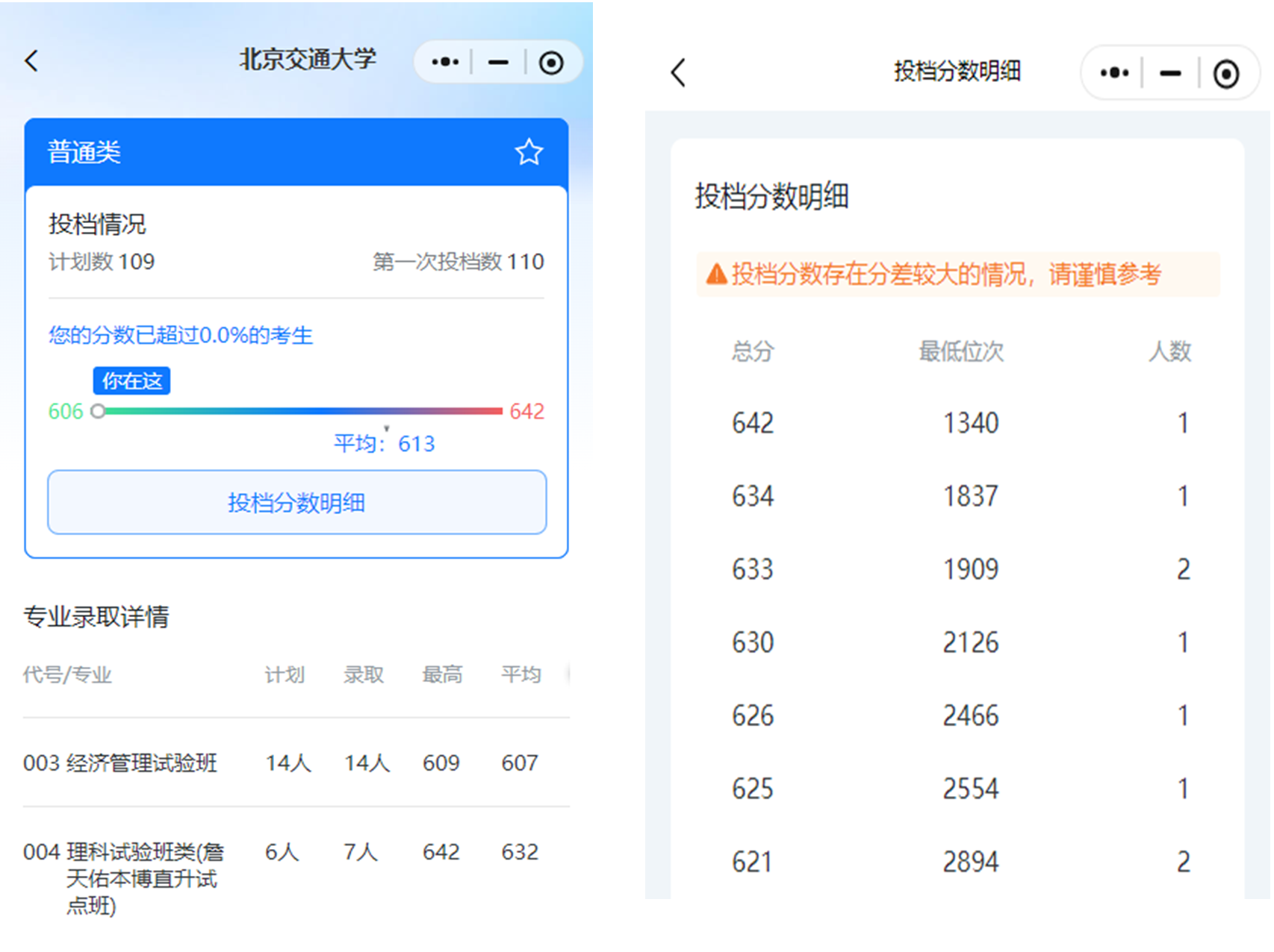 还能查看自身分数在对应院校往年投档分数中的位置,点击“投档分数明细”查看专业往年投档分数详情,从而能更好地选择院校。
