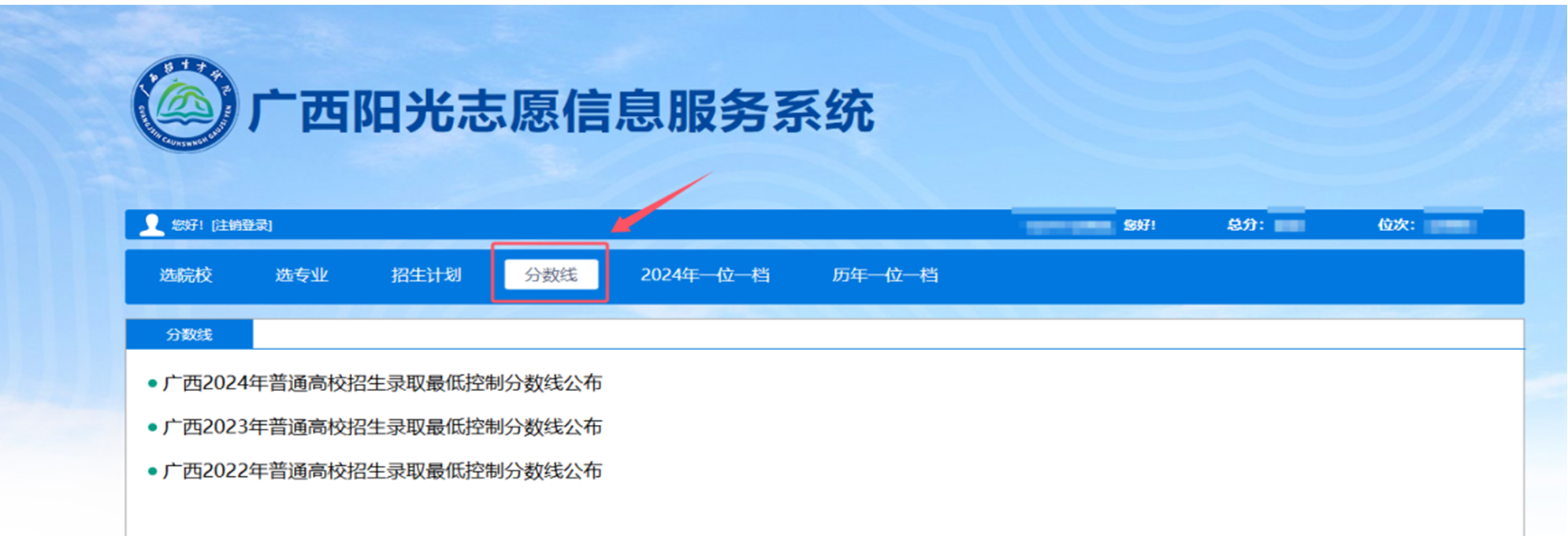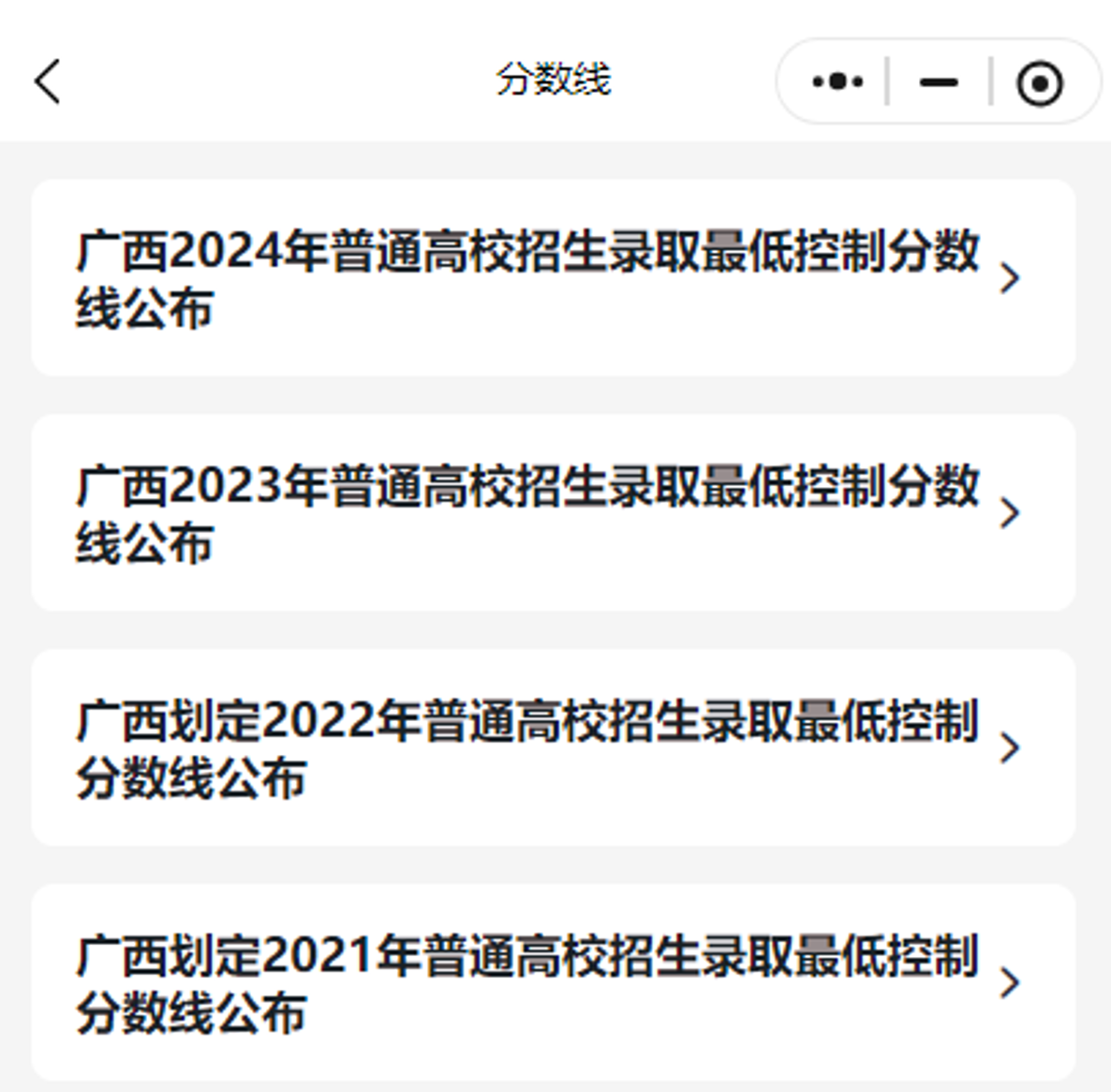 此外,在PC端点击“分数线”,或者在微信小程序点击“最低录取控制分数线”,可查看2022年至2025年“广西招生考试院网站”发布的最低录取控制分数线信息。