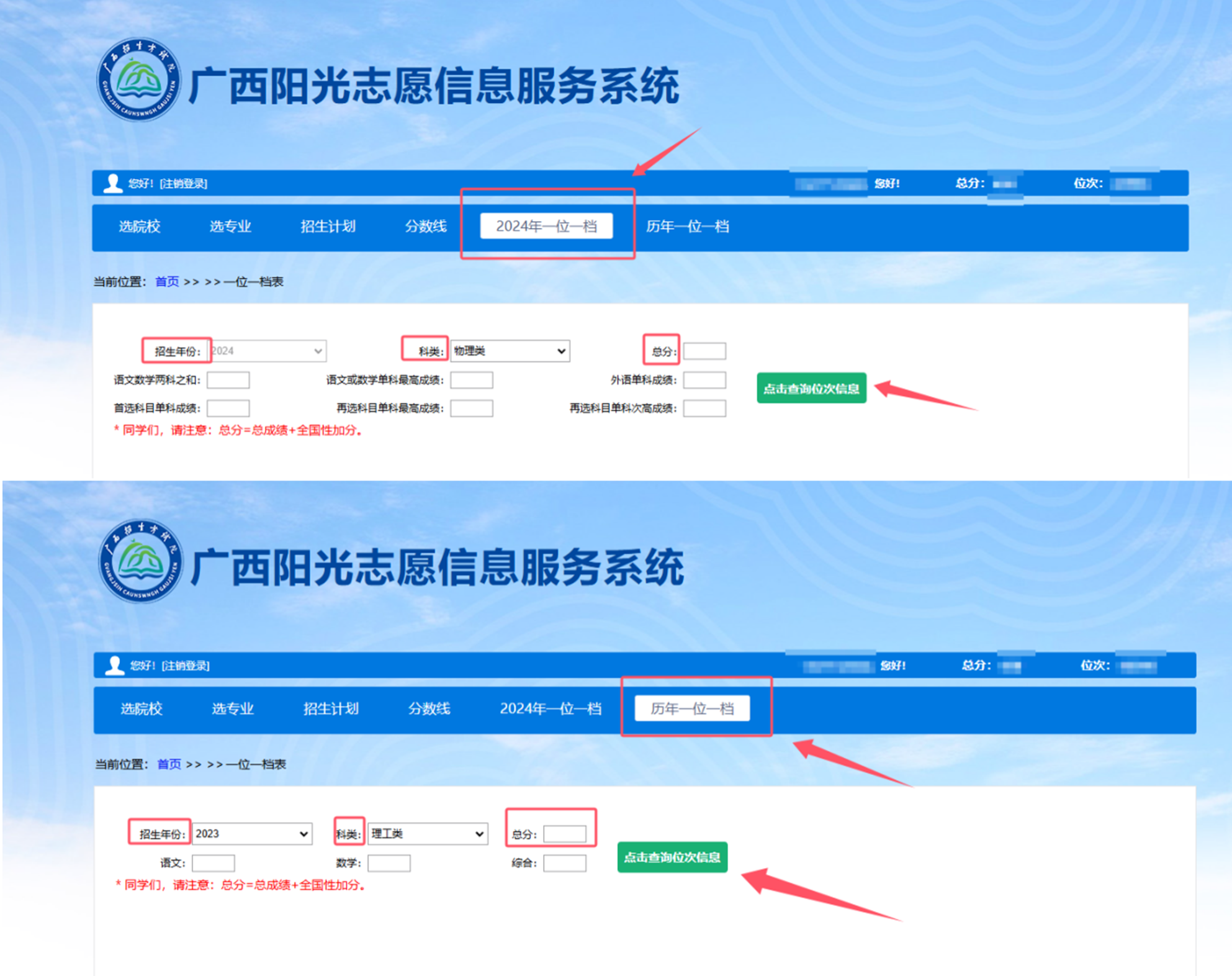 系统还可查询历年一位一档信息,可选择不同科目、分数段或输入指定分数查询名次,还能输入分数组合精准检索位次。