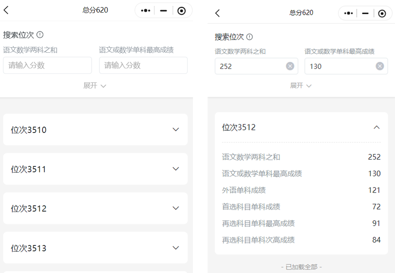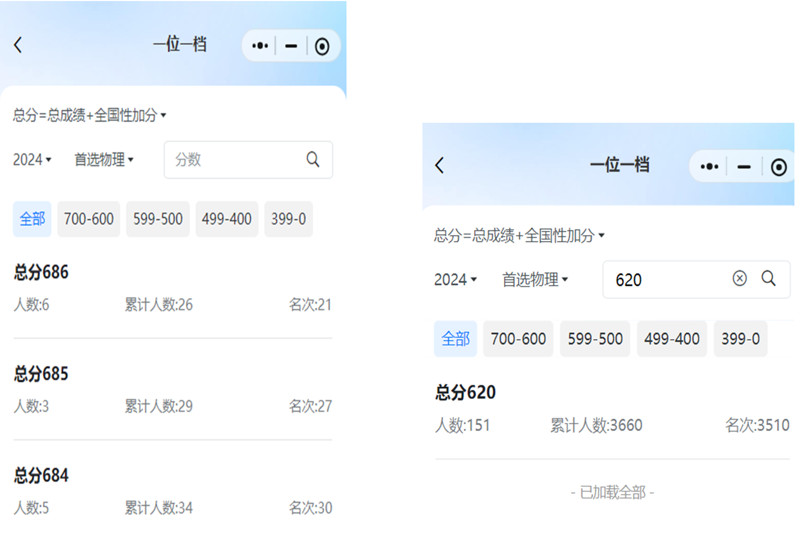 微信小程序:点击“一位一档”,进入名次查询功能页面,可选择不同的科目、分数段查询名次情况,也可输入指定分数查看对应名次。