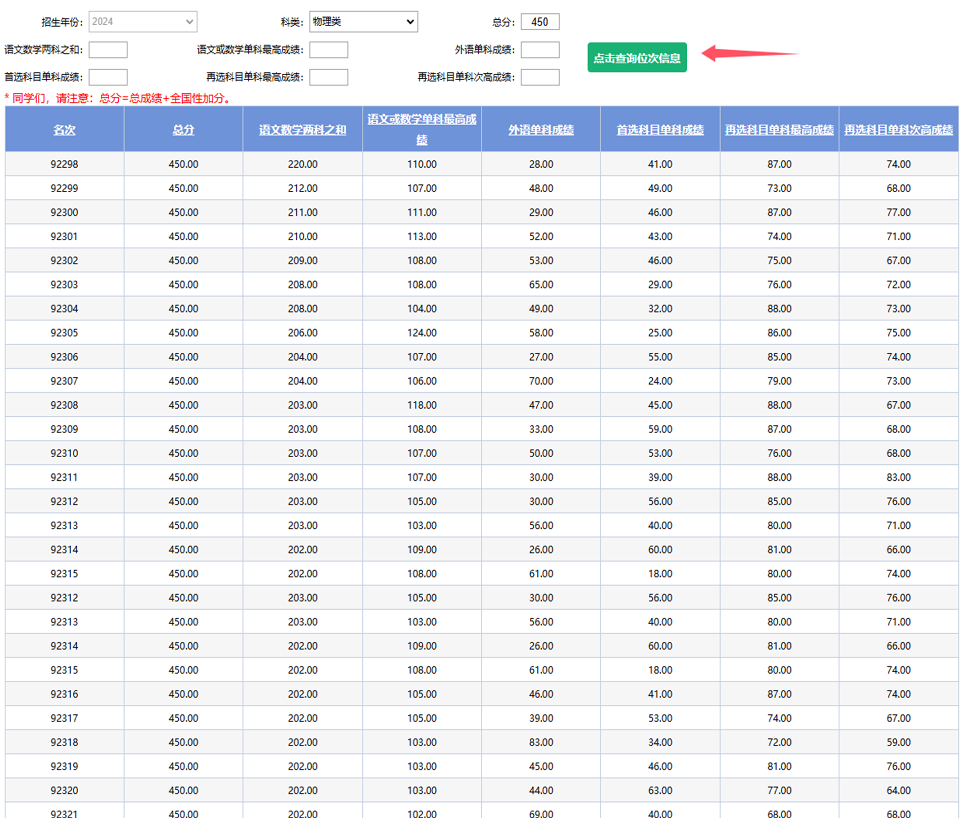 点击分数进入同分位次页面,可查看该分数对应的所有位次。若需精准查询考生位次,可输入分数组合进行检索,助力考生精准定位自身分数所处位次,从而更科学地开展填报志愿工作。