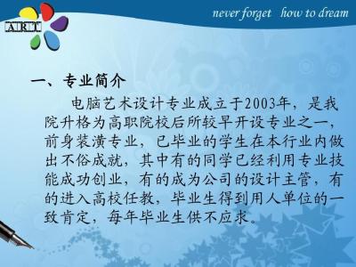 本专业培养德、智、体全面发展,具备艺术美感和创作鉴赏能力,具备独立从事平面设计、环艺设计、网页设计以及多种艺术设计等工作能力的高级技术型应用人才。毕业生能在广告公司、综合企业、网络公司工作。要求掌握电脑艺术创作软件及艺术的基本理论和基本知识,具有艺术美感和创作鉴赏能力,能够利用多种软件工具实现不同设计项目。